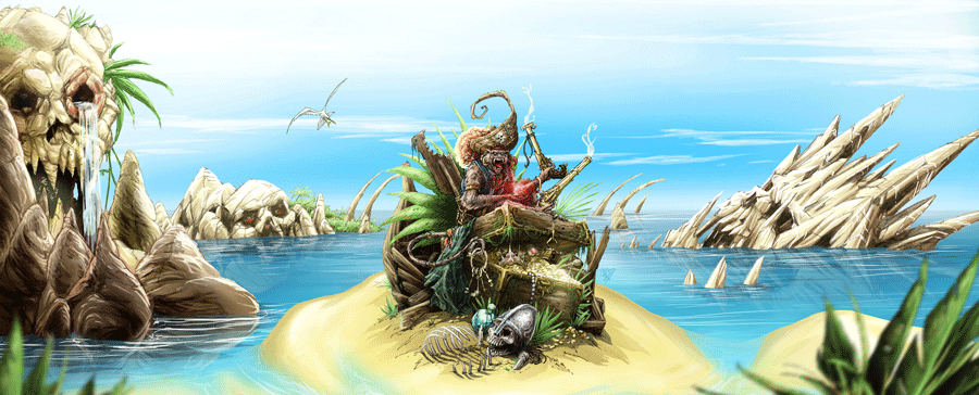 L'ombre des rochers à gauche devrait être atténuée aussi, elle attire l’œil. Je recommande plus de perspective atmosphérique sur les deux rochers-crâne de l'arrière-plan, en particulier sur celui de gauche. Et leurs reflets dans l'eau sont vraiment trop marqués et trop nets. Regarde des photos de lagon ou d'océan, on voit vraiment mais vraiment peu de reflets, principalement parce que ce sont des plans d'eau en mouvements contrairement aux flaques d'eau qui agissent comme un miroir.