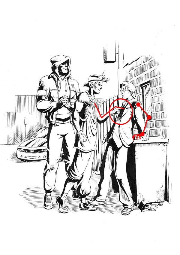 Voici des corrections qui selon moi, seraient importantes : Enfoncer le doigt du méchant dans la veste de gentil pour le rendre plus agressif " là, c'est limite s'il ne lui chatouille pas le bout du téton), et le bras du gentil qui est pas super bien placé par rapport au mouvement de recul.