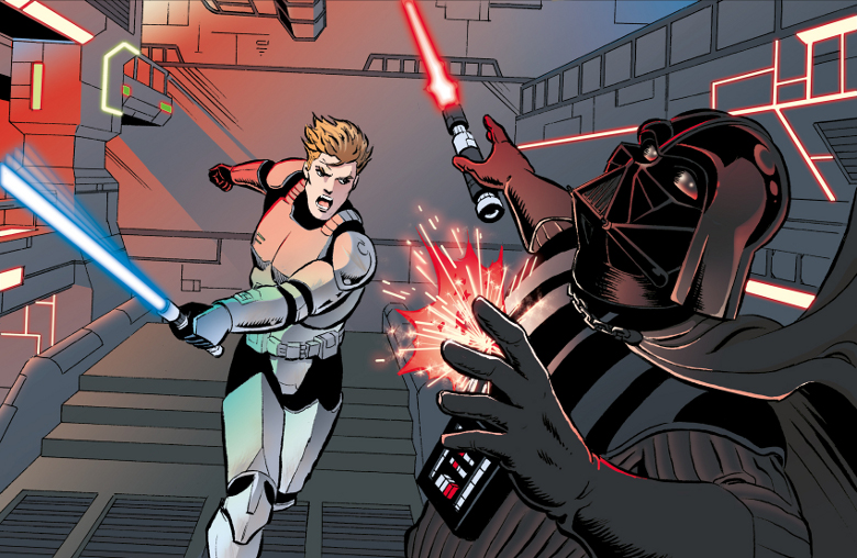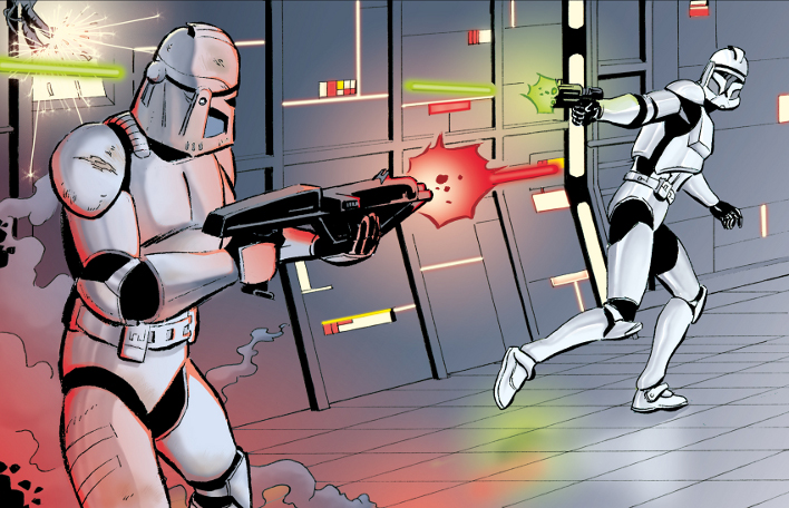 quelques indications, quand même, le héros de l' histoire est le clone qui canarde l' autre, on le retrouve en duel face à Darth vader (et dans le vaisseau pris en chasse par les Tie)